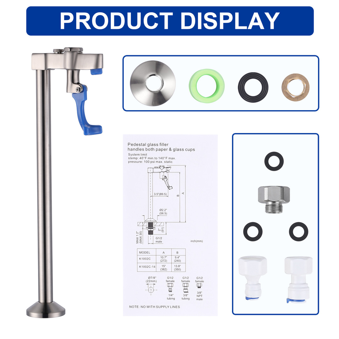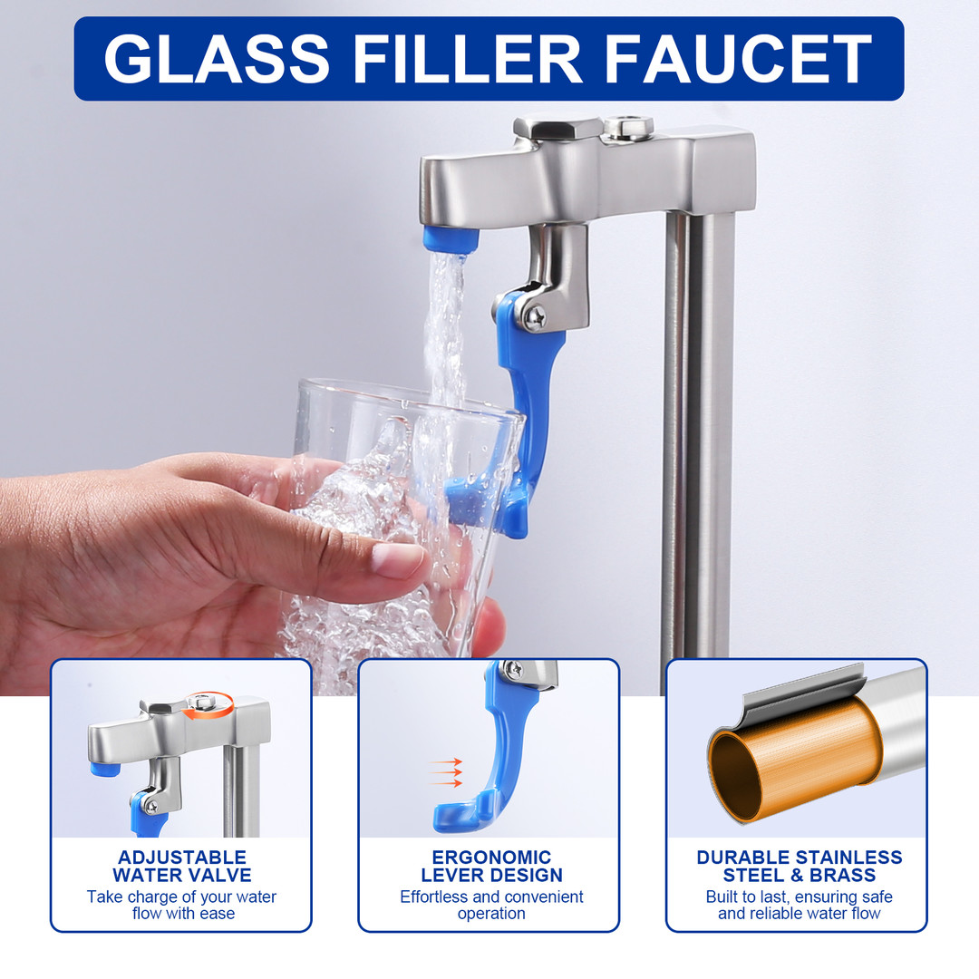 Upgrade your beverage service with this glass filler faucet (available in 2 height sizes). Simply press a cup/container against the blue lever to activate smooth, splash-free water flow. Crafted from durable stainless steel and brass, it features an ergonomic design for effortless one-handed use, an adjustable valve for precise flow control, and suits bars, restaurants, cafes, hotels, or home kitchens.
