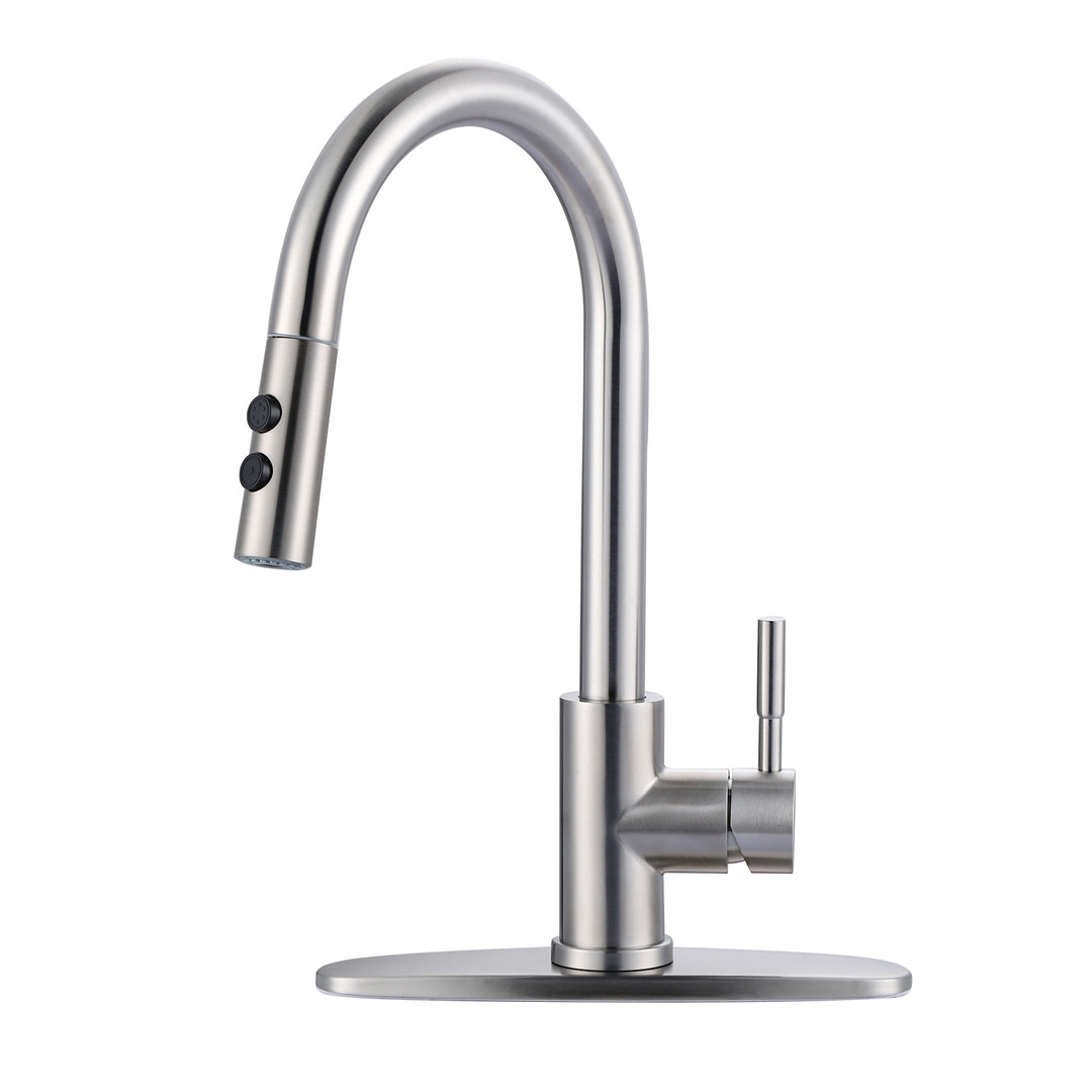 This pull-down kitchen faucet can enhance the style of your kitchen and improve cleaning efficiency. Its sleek and delicate appearance with a natural transition adds elegance and a modern atmosphere to the kitchen. The length of the retractable hose is sufficient to reach every corner of the sink, and the dual-function spray head meets all your cleaning needs. The solid single handle ensures smooth and graceful operation each time it is turned on or off. Equipped with a soap dispenser, it makes cleaning even more convenient.