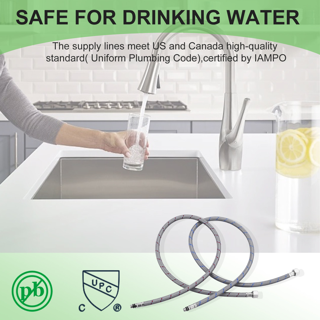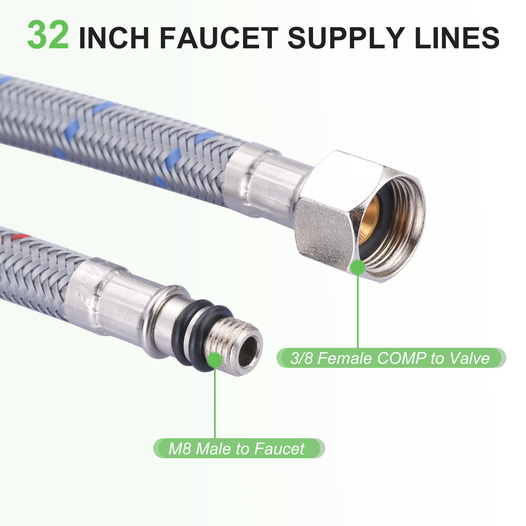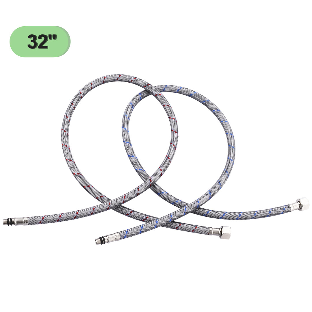 Enhance the reliability and performance of your kitchen or bathroom faucet with our 2 Pieces Nylon Supply Lines. Engineered for durability and ease of installation, these supply lines are designed to meet the highest standards, featuring cUPC and NSF certifications. The M8 male to 3/8 inch female compression fittings ensure a secure and leak-proof connection, while the 32-inch length offers ample reach for various installations. Made from high-quality nylon, these supply lines are both flexible and robust, providing a dependable solution for your plumbing needs.