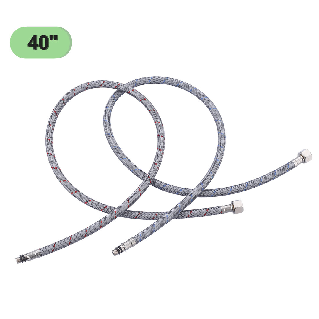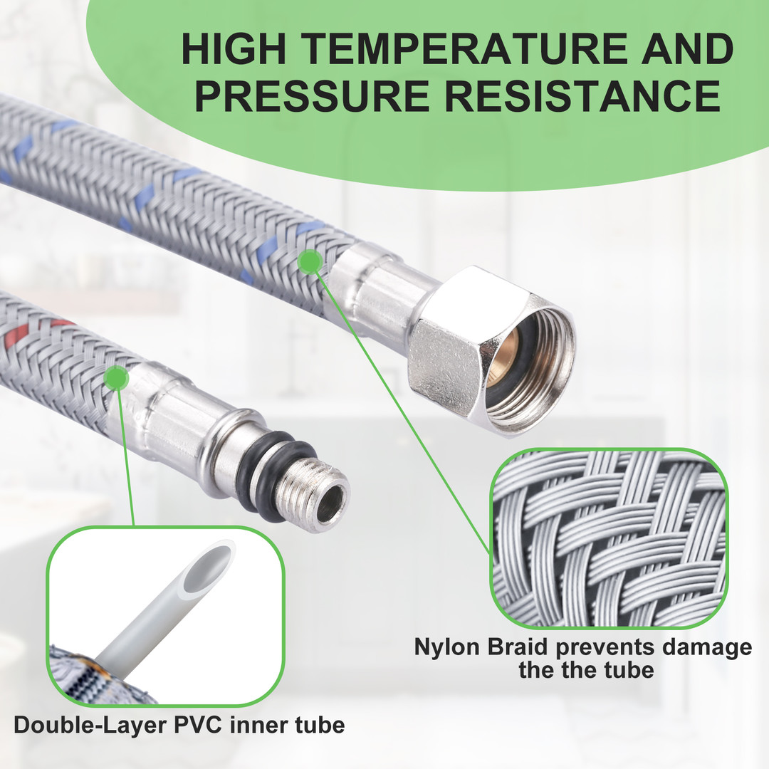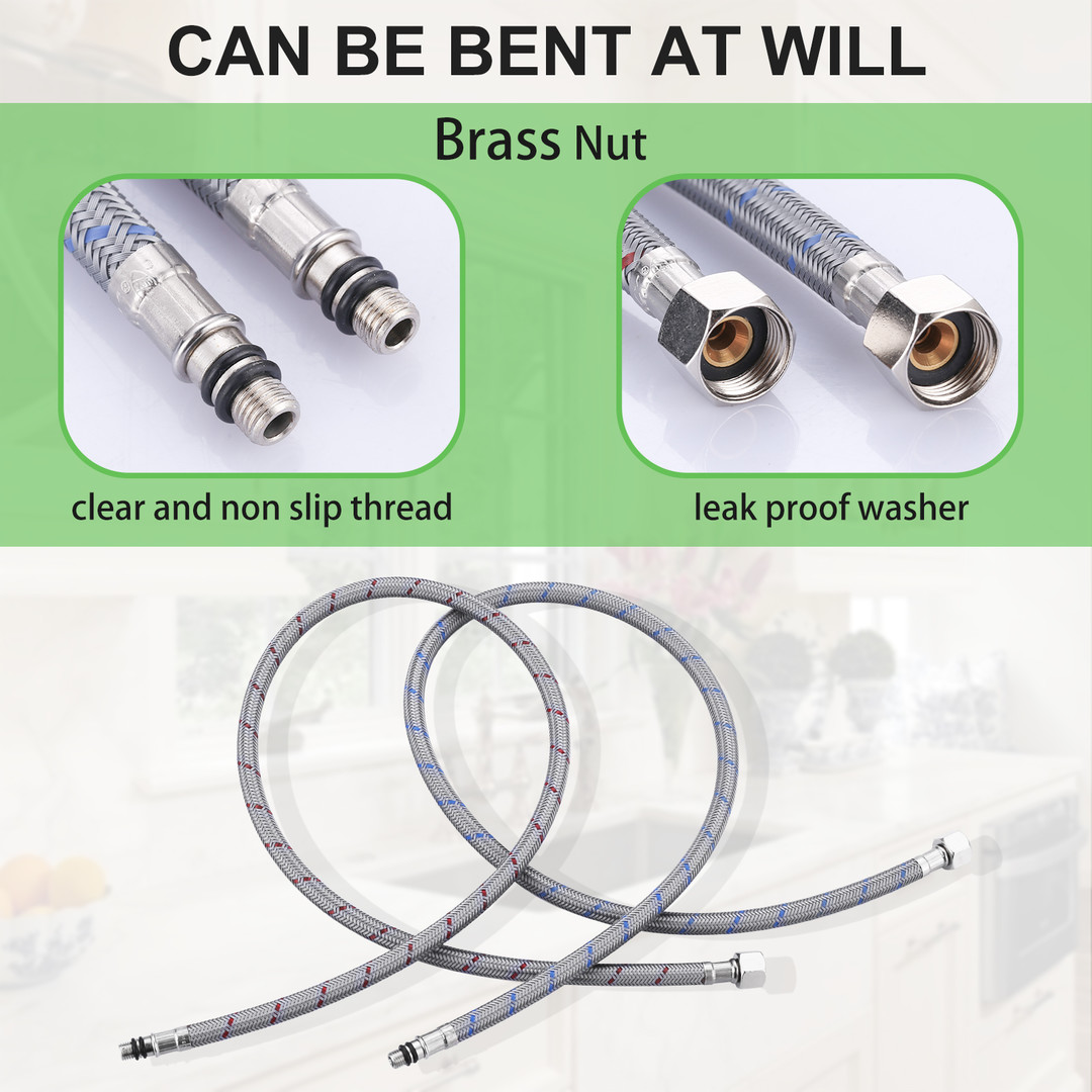 Enhance the reliability and performance of your kitchen or bathroom faucet with our 2 Pieces Nylon Supply Lines. Engineered for durability and ease of installation, these supply lines are designed to meet the highest standards, featuring cUPC and NSF certifications. The M8 male to 3/8 inch female compression fittings ensure a secure and leak-proof connection, while the 32-inch length offers ample reach for various installations. Made from high-quality nylon, these supply lines are both flexible and robust, providing a dependable solution for your plumbing needs.