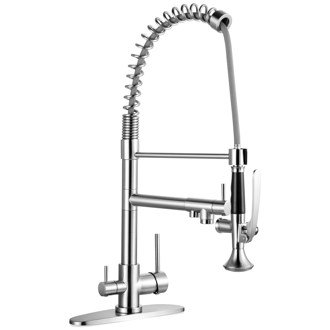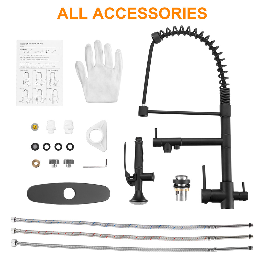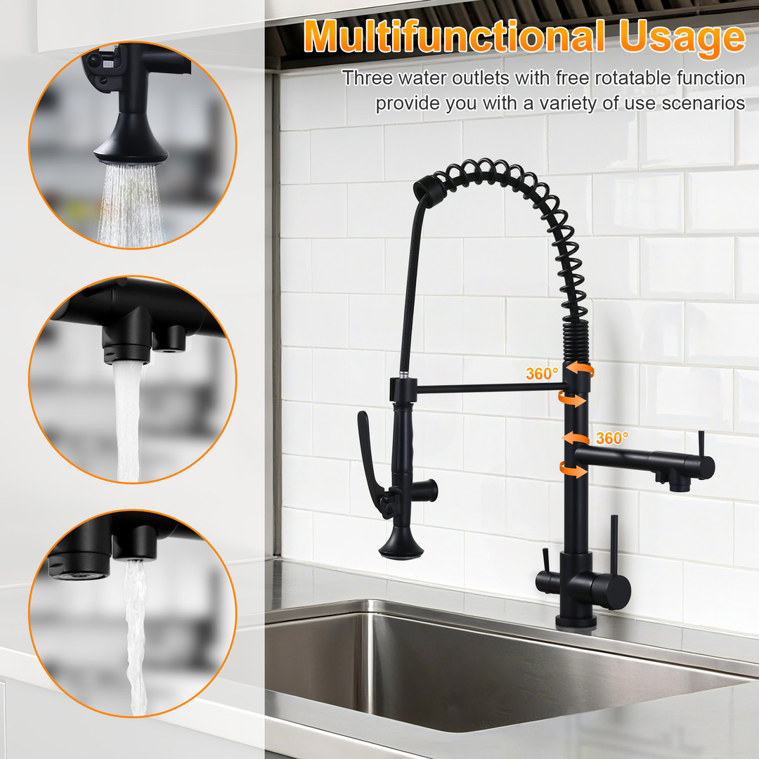 Upgrade your commercial kitchen with ALEASHA 3-in-1 Pull-Down Faucet. The high-arc spout provides clearance for large pots and trays, while the pull-down sprayer ensures precise rinsing. Made from premium brass, it’s built for demanding kitchens. 3 handles control spray, stream, and drinking water, boosting efficiency. Ideal for restaurants, cafeterias, or any professional kitchen, this faucet delivers versatile, precise, and reliable performance.