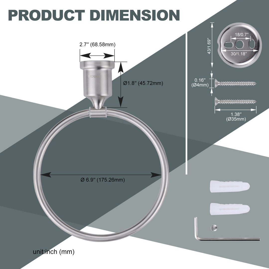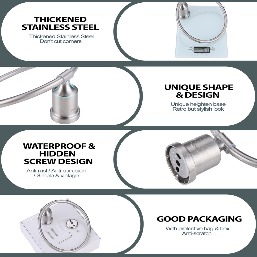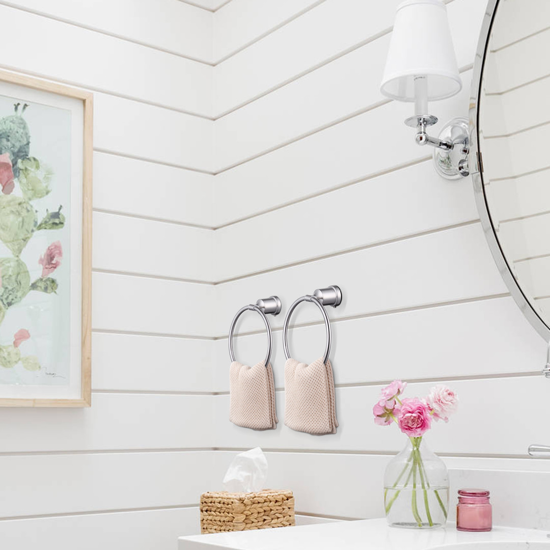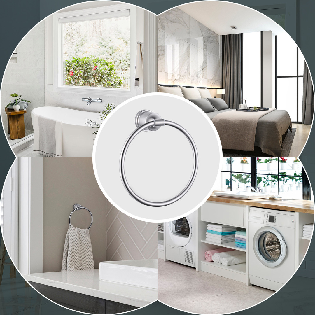 Enrich your space with this Wall Mounted Towel Ring in Brushed Nickel. It can easily elevate you??re your home with its round corner design and widened support rod. This helps to make sure the towel ring is safe for children’s bathrooms and provides better ventilation to keep your towel dry. The towel ring rotates 180 degrees and is resistant to rust and corrosion. This is a durable choice for your space.