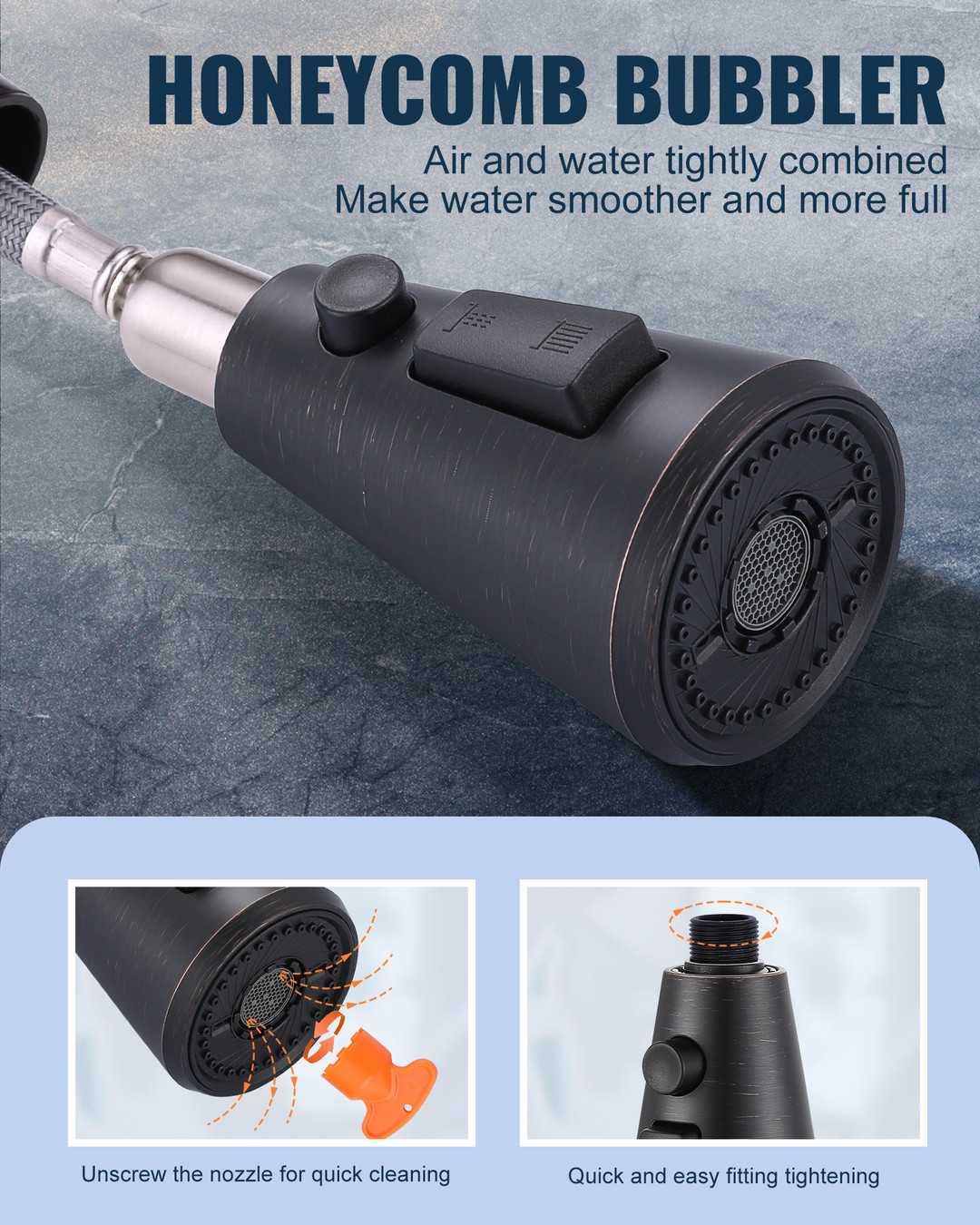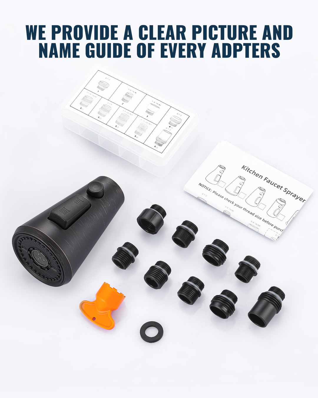 IVIGA 3-Function Pull-Down Kitchen Faucet Spray Head is an ideal upgrade accessory for household kitchen faucets, combining durability with lightweight convenience. The nozzle easily switches between three water flow modes, meeting diverse kitchen needs. It comes with nine adapters, widely compatible with various faucet connectors on the market, enabling simple installation without the need for professional tools.