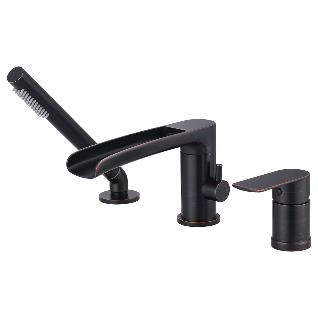 ALEASHA Deck-Mounted Roman Bathtub Faucet features a modern minimalist design, combining sleek lines with a wide waterfall spout to create a luxurious bathing experience. Equipped with an independent single-handle control valve, it allows for easy temperature adjustment. Paired with an elegant handheld showerhead, the hose can be freely extended and retracted, offering versatile functionality. This Roman bathtub faucet delivers an efficient, comfortable, and modern water usage experience, enhancing both the style and practicality of your bathroom space.