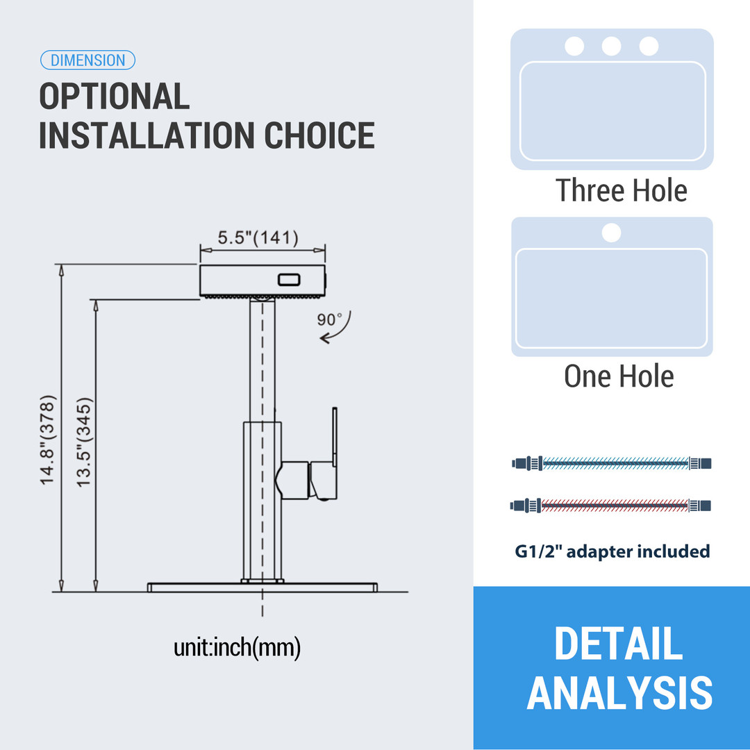 This Aleasha pull-out faucet offers three powerful functions, with an adjustable spray head that can switch between horizontal and vertical for maximum flexibility. Enjoy a wide waterfall flow, perfect for kitchen or bar sinks. The sleek square design adds a modern touch to your space. Plus, with the included soap dispenser, your kitchen cleaning tasks become even more convenient.