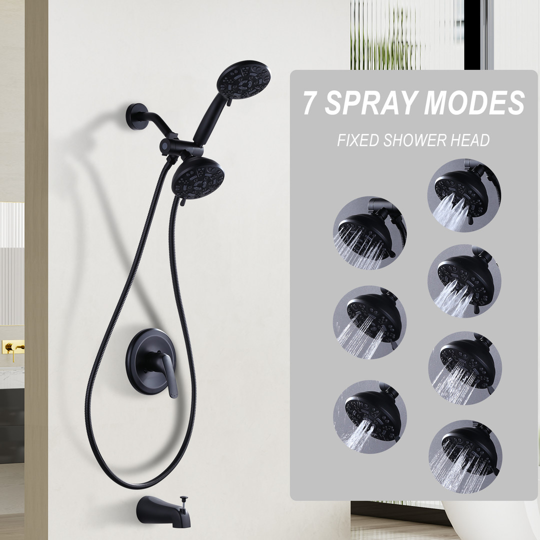 7-Spray Round Wall-Mount Handheld Fixed and Handheld Shower Head 1.8 GPM with Tub Spout in Matte Black