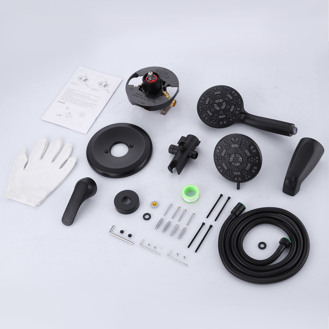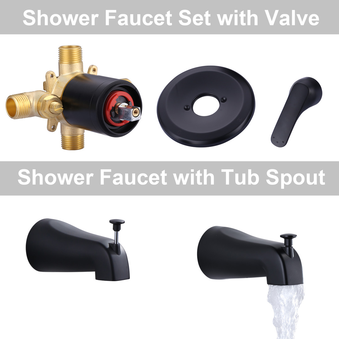 This sophisticated shower faucet features both a fixed showerhead with 7 adjustable settings and a handheld showerhead, offering a variety of personalized shower experiences. The single-handle design provides convenient adjustments. For added versatility, we have also incorporated a slip-on tub spout into the design. Built with a solid brass valve, this shower faucet promises durability and superior quality.