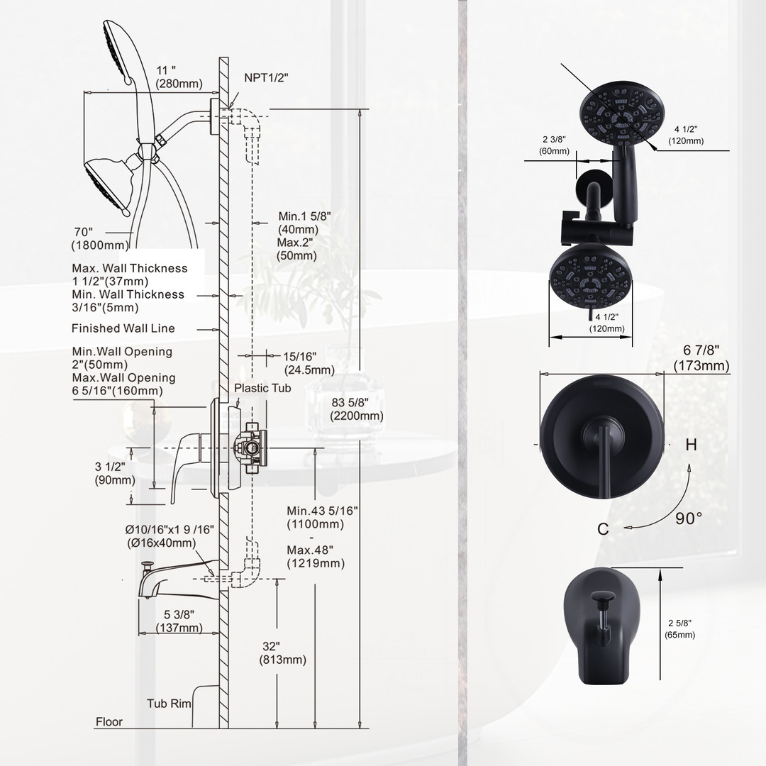 • 1-fixed shower head, 1-handheld shower head and 1-tub spout