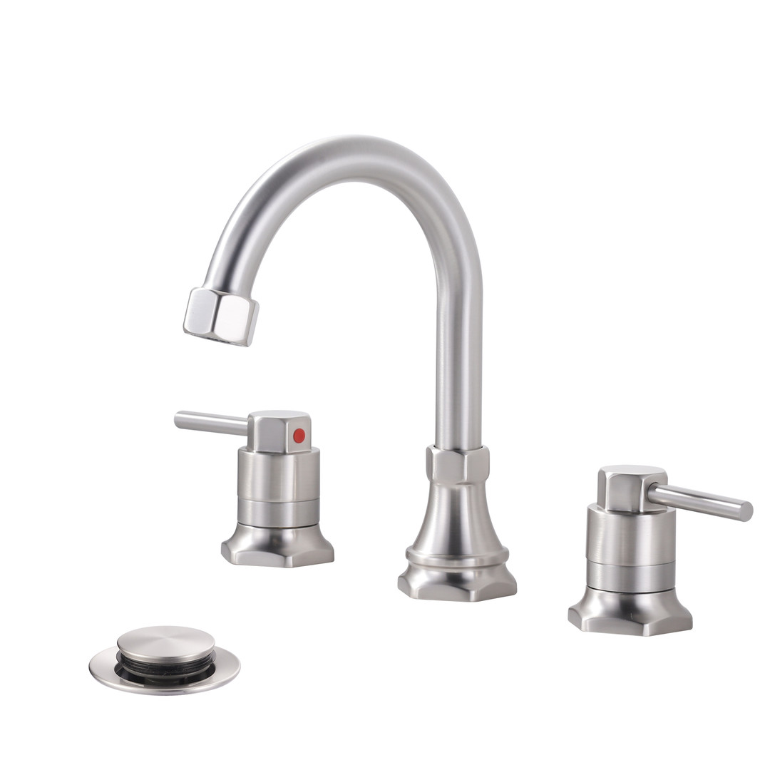 Upgrade your bathroom experience with this ALEASHA 8 in. Wide Dual-Handle Faucet, crafted from premium zinc alloy and stainless steel for both durability and modern style. The dual-handle design makes temperature control effortless, whether you are washing hands, brushing teeth, or rinsing your face. Built with high-quality ceramic cartridges, it ensures worry-free, long-lasting performance. The faucet comes with a pop-up drain for easier sink cleaning, along with complete water supply hoses and quick-connect pipes for fast, hassle-free installation.