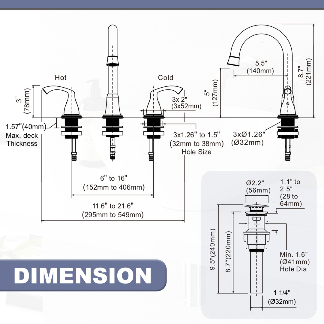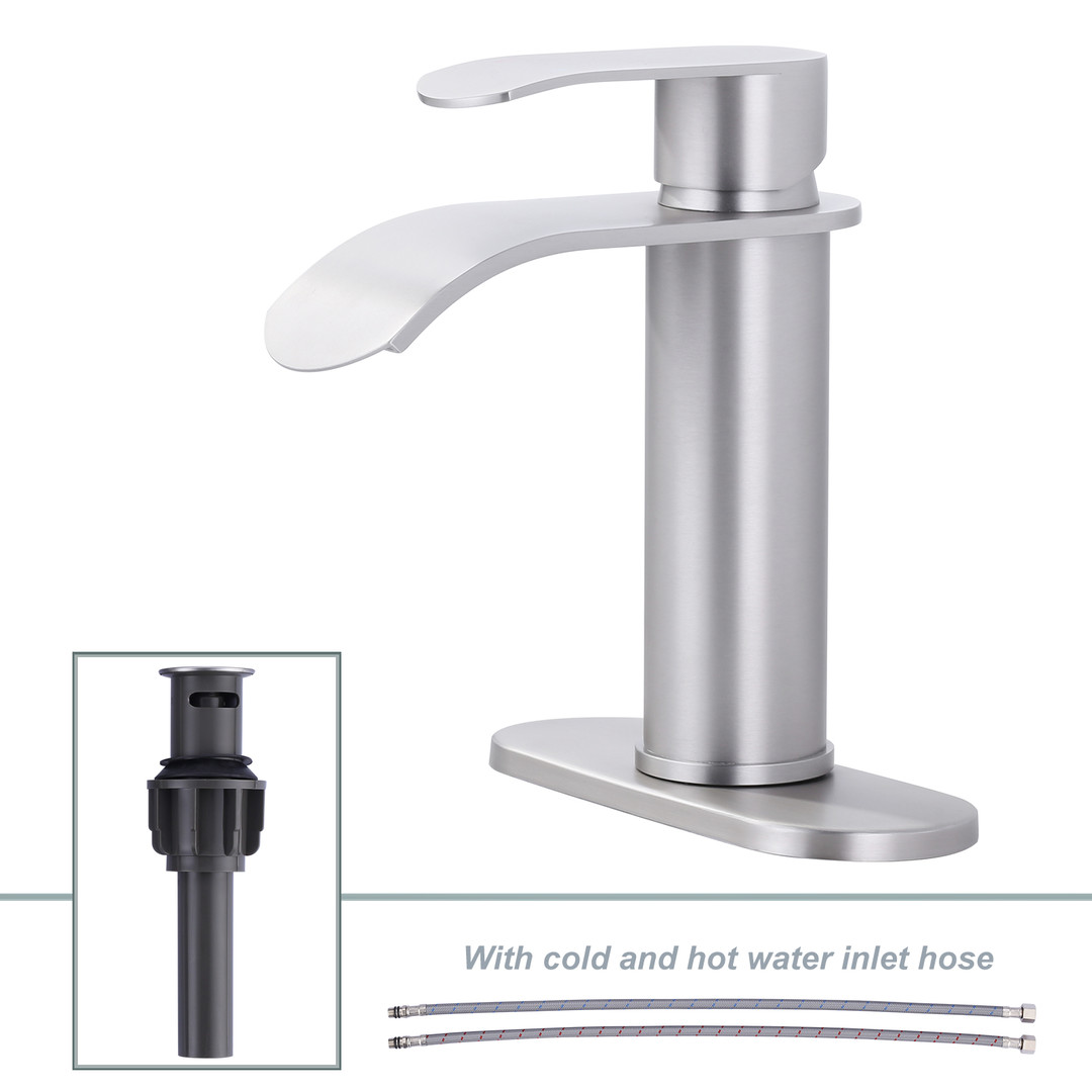 This 3-piece bathroom faucet set is designed for easy installation and smooth water flow. It features a high arc spout and a water-saving 2.2GPM aerator. The push-to-open drain is user-friendly and leak-proof. Crafted from durable brass with a corrosion-resistant finish, this faucet is built to last and adds practical elegance to any bathroom.