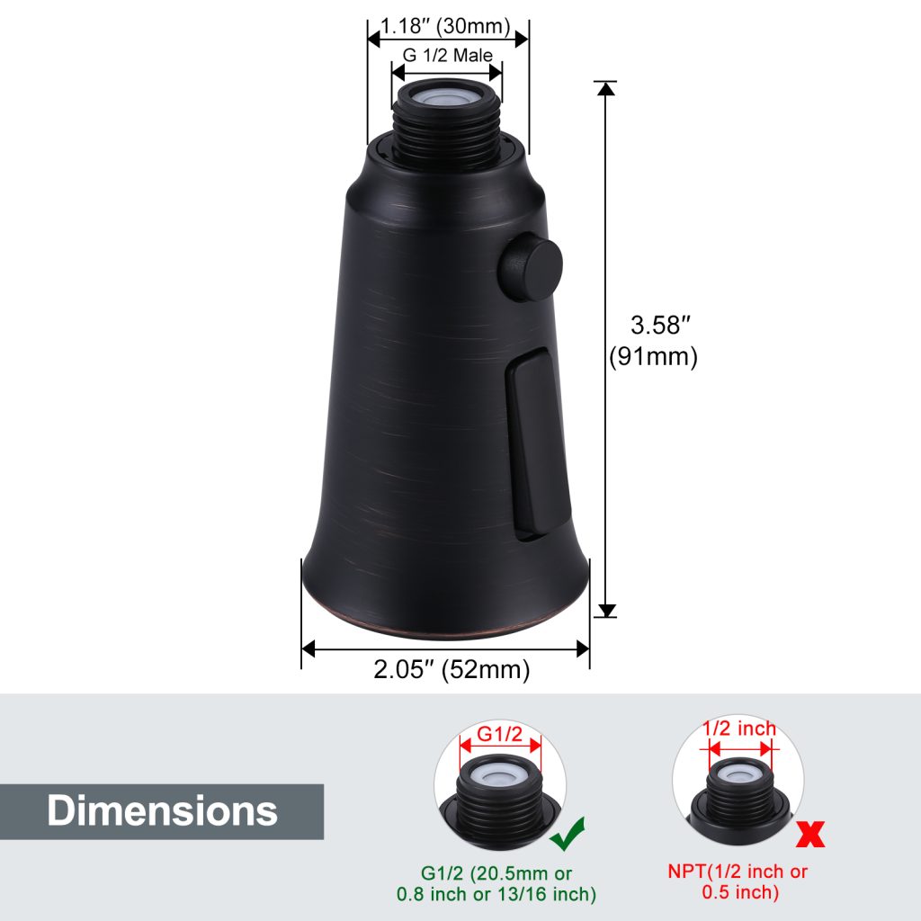 • Pull-out faucet sprayer head is only suitable for G1/2 connector (male) (approximately 2 cm or 0.8 in.), non-NPT, non-universal, please check the size and hose connection type before purchasing