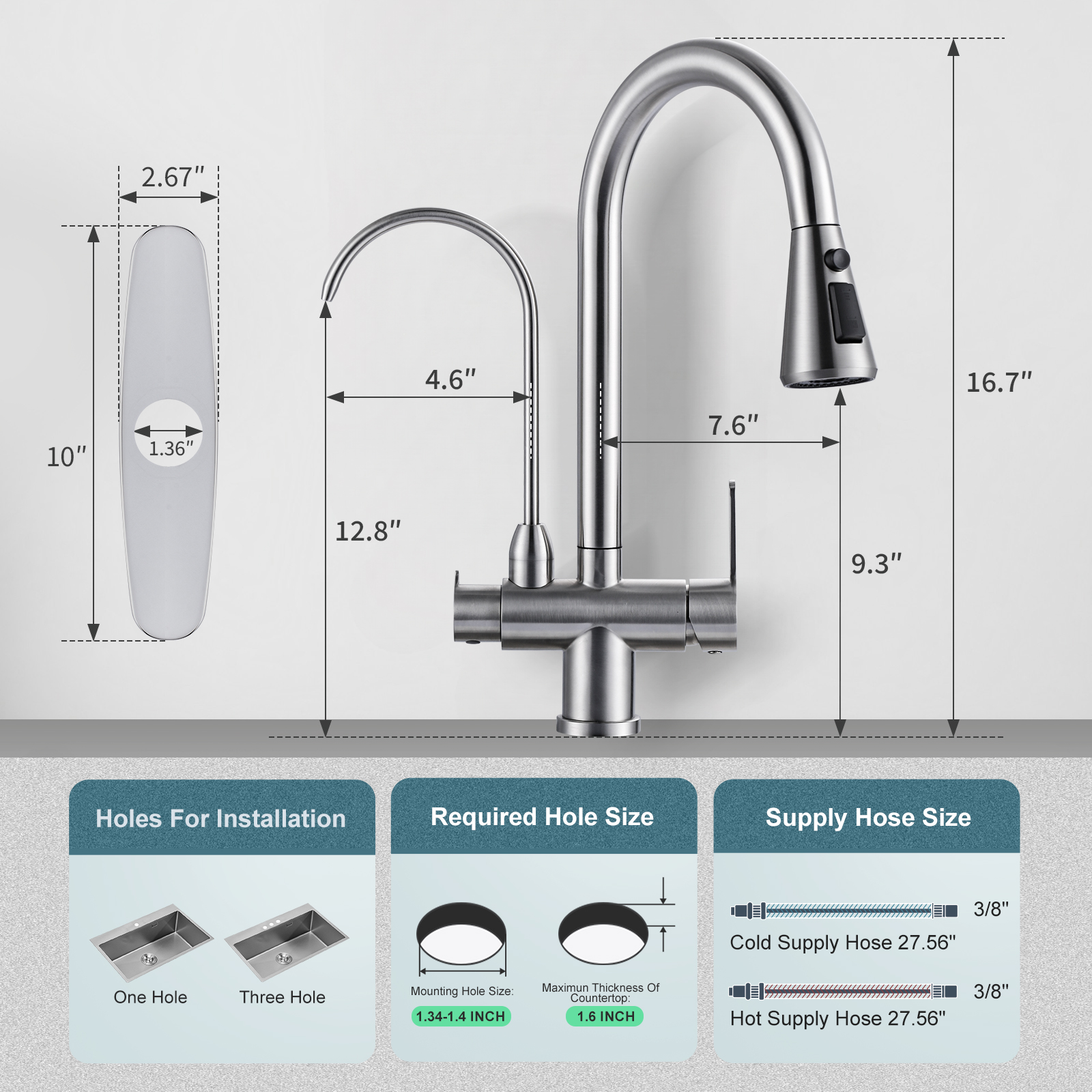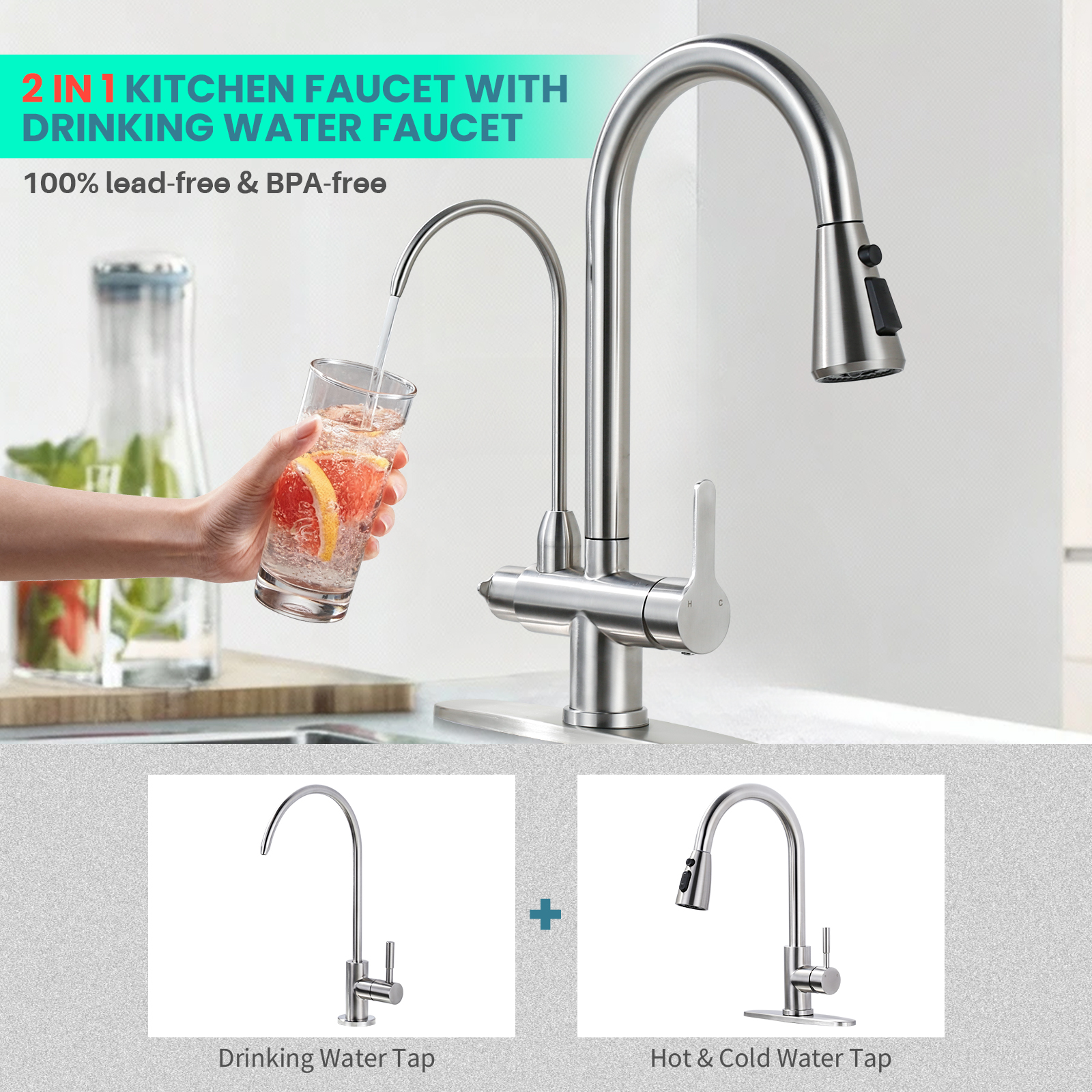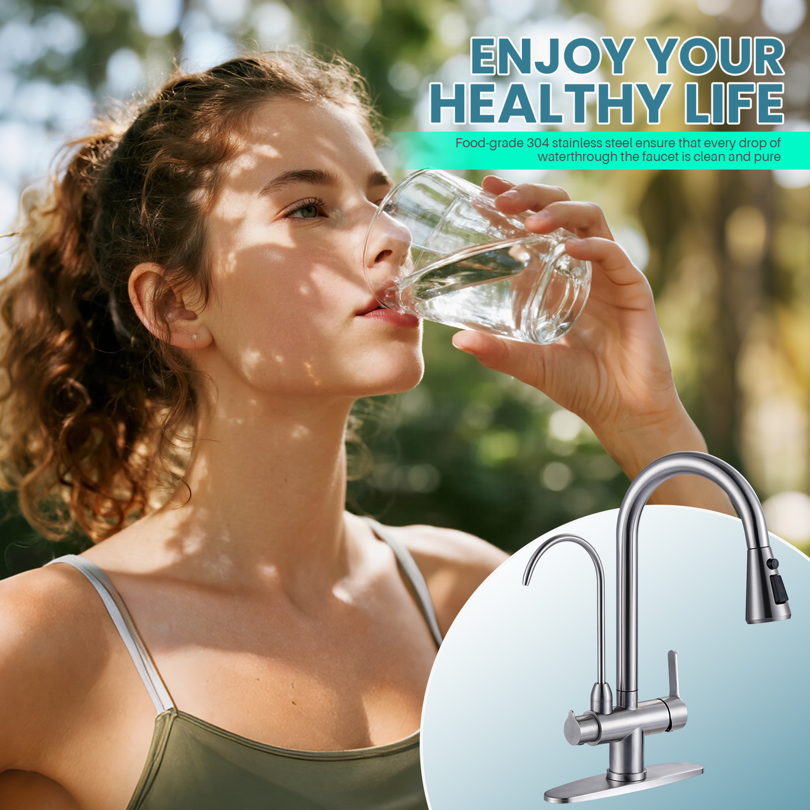 Elevate your kitchen experience with our high-arch pull-down dual-function faucet. Combining a pull-down faucet and direct drinking water faucet, it offers 3 streaming modes for diverse cleaning needs. The adjacent direct drinking faucet connects directly to a filtration system, delivering fresh, purified drinking water. The dual-outlet design saves space while enhancing overall kitchen functionality. Crafted from premium 304 stainless steel, it’s durable and easy to clean, featuring leak-proof construction for water conservation and environmental friendliness. Experience this high-quality faucet today and bring health and convenience within reach.