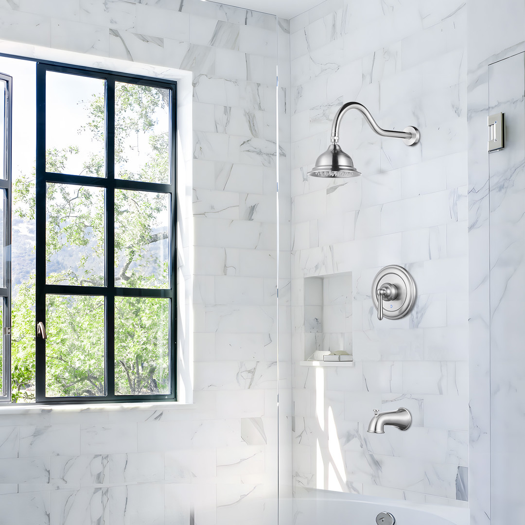 ALEASHA Tub and Shower Faucet Set combines daily practicality and long-lasting aesthetics to achieve perfect bathroom renewal. The 6 in. shower head has a flow rate of 1.8GPM, providing you with a comfortable rain shower experience. Equipped with a sturdy lever handle, it has long-lasting durability and drip free performance. The set includes a shower head, pressure balance valve, lever handle, and split bathtub spout.