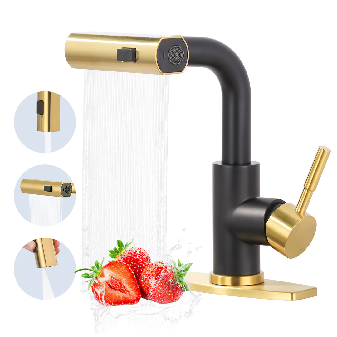 Designed specifically for small bar sinks and compact kitchens, this bar sink faucet is made of stainless steel with a fingerprint-resistant surface. The pull-out spray head offers adjustable water flow modes via a rotating nozzle and button, and the hose extends up to 17 in. providing full coverage of the sink area. ?Pre-installed with hot and cold water supply hoses featuring standard 3/8 in. connectors, this faucet includes G1/2 in. adapters, making it compatible with a wide range of household valve interfaces.