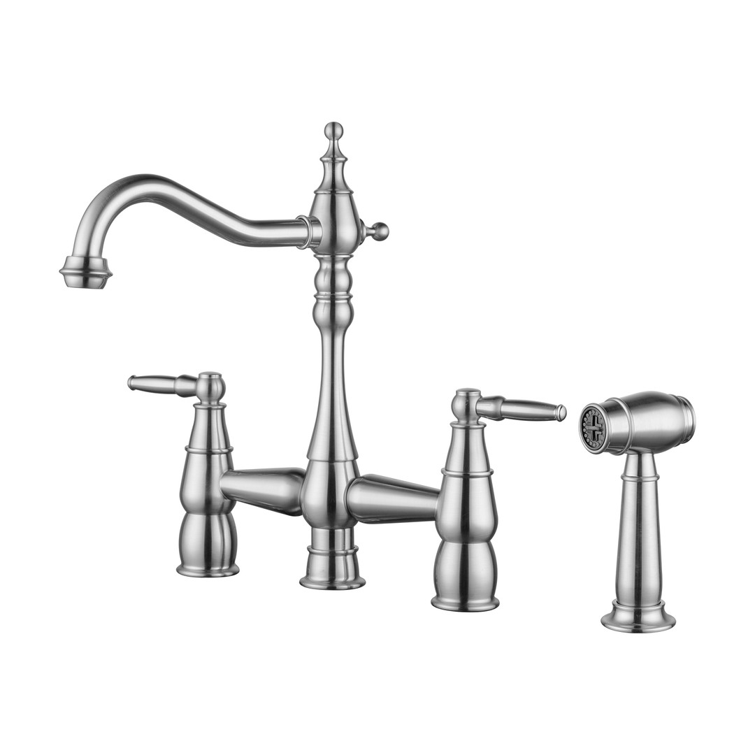 Quaint Double Handle Vintage Bridge Kitchen Faucet-Side Spray in Brushed Nickel