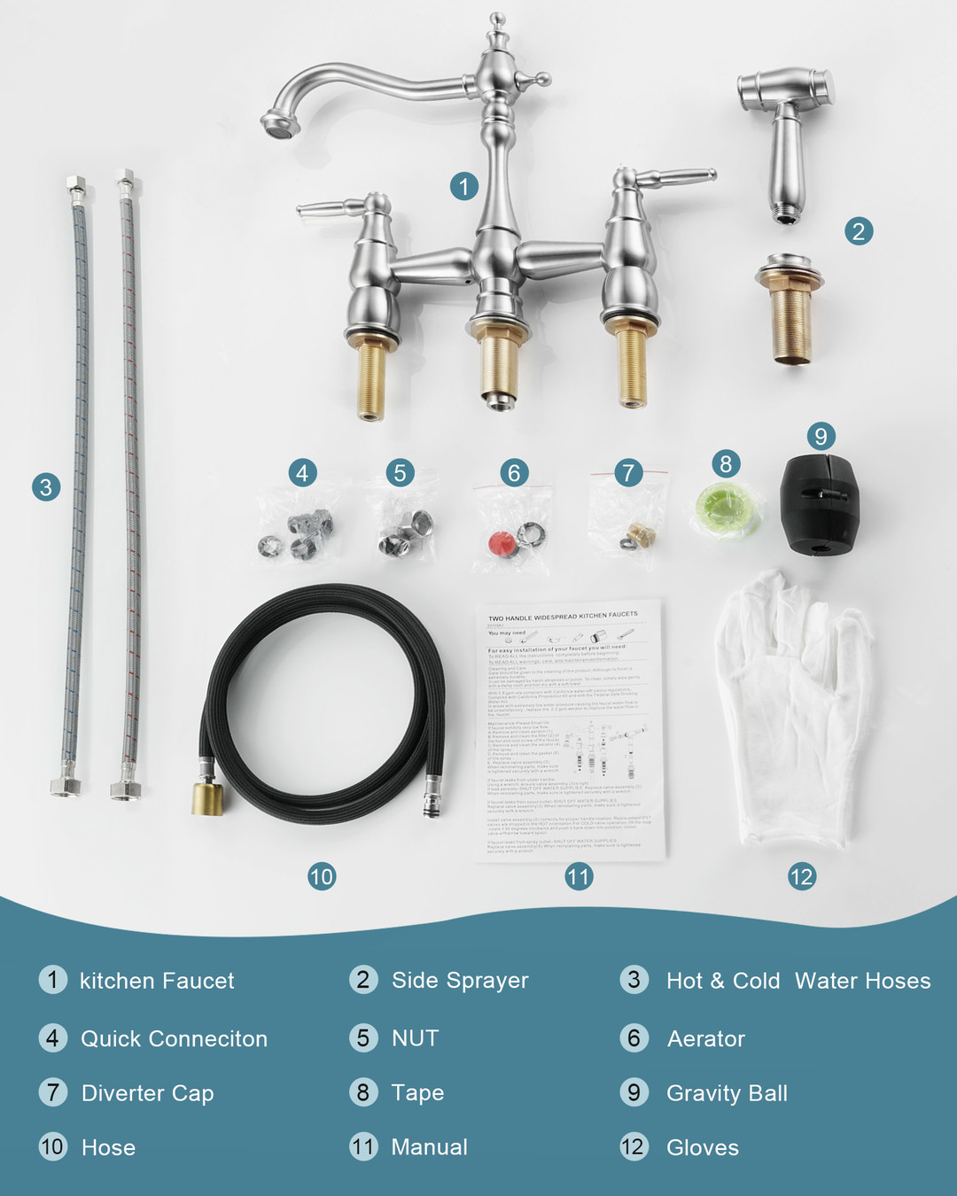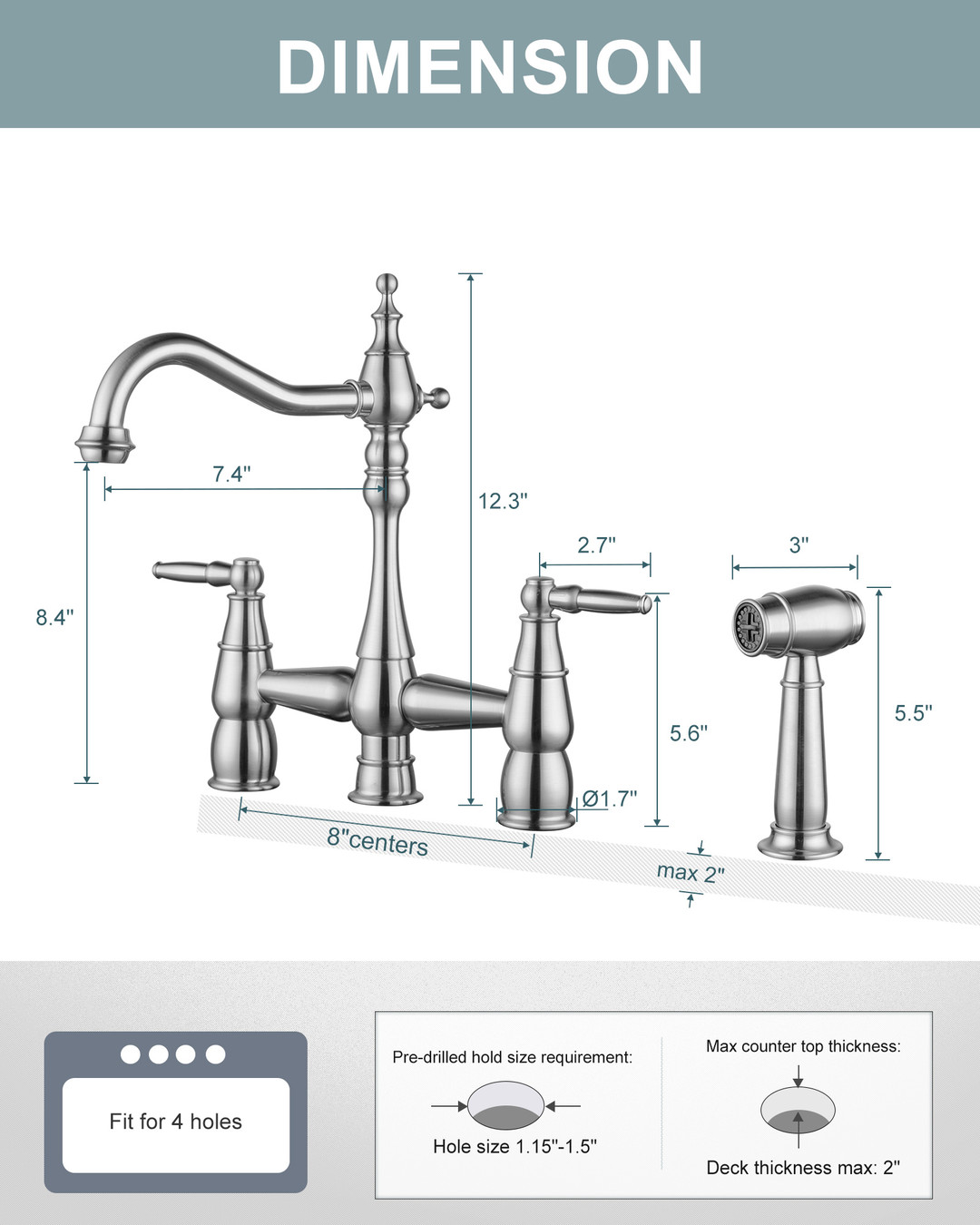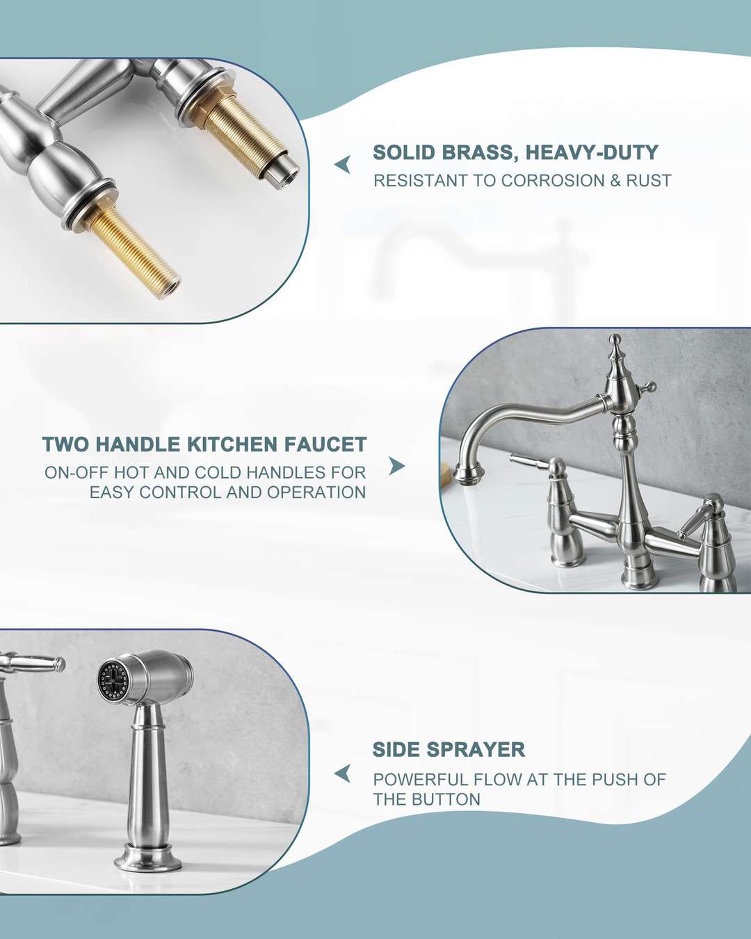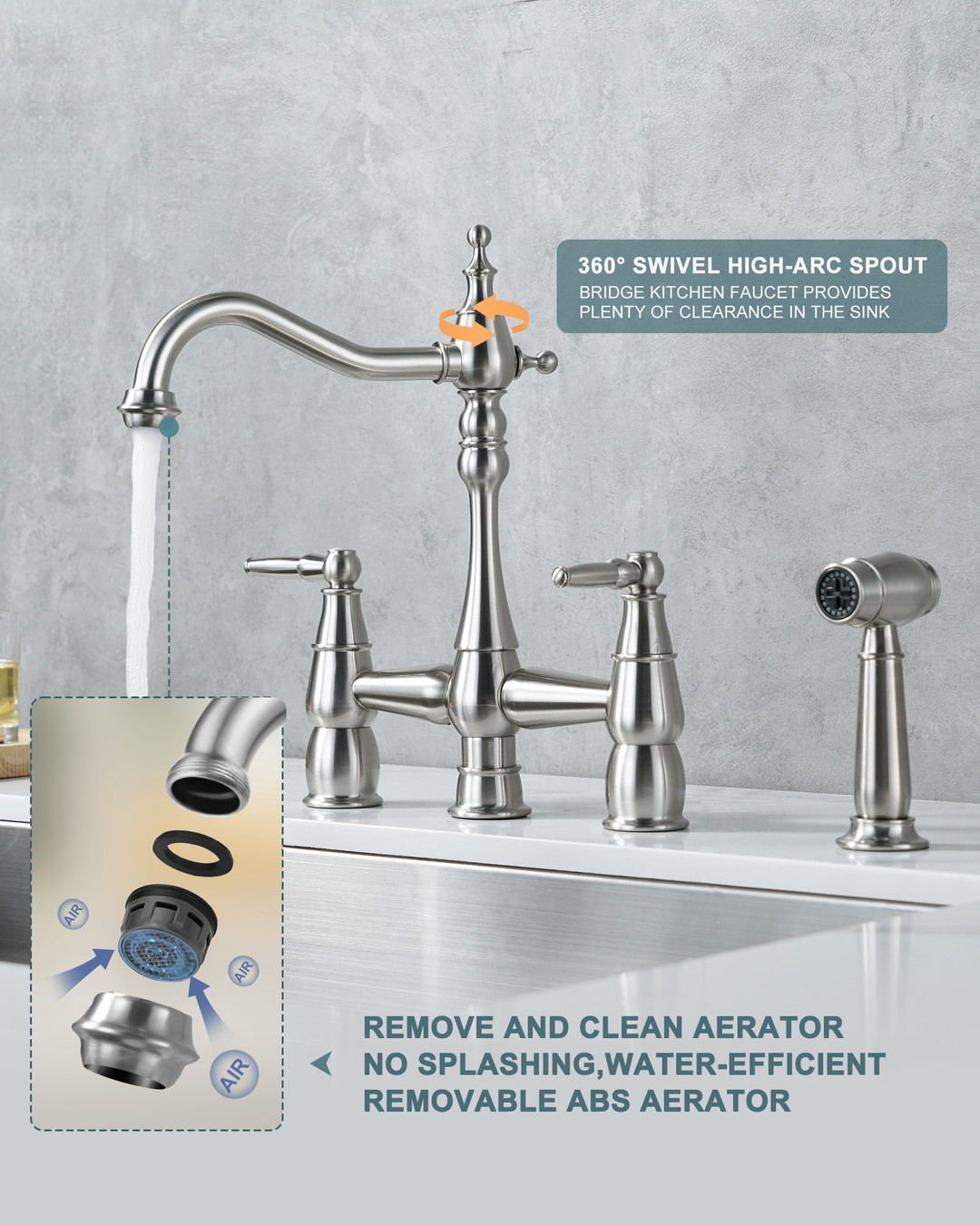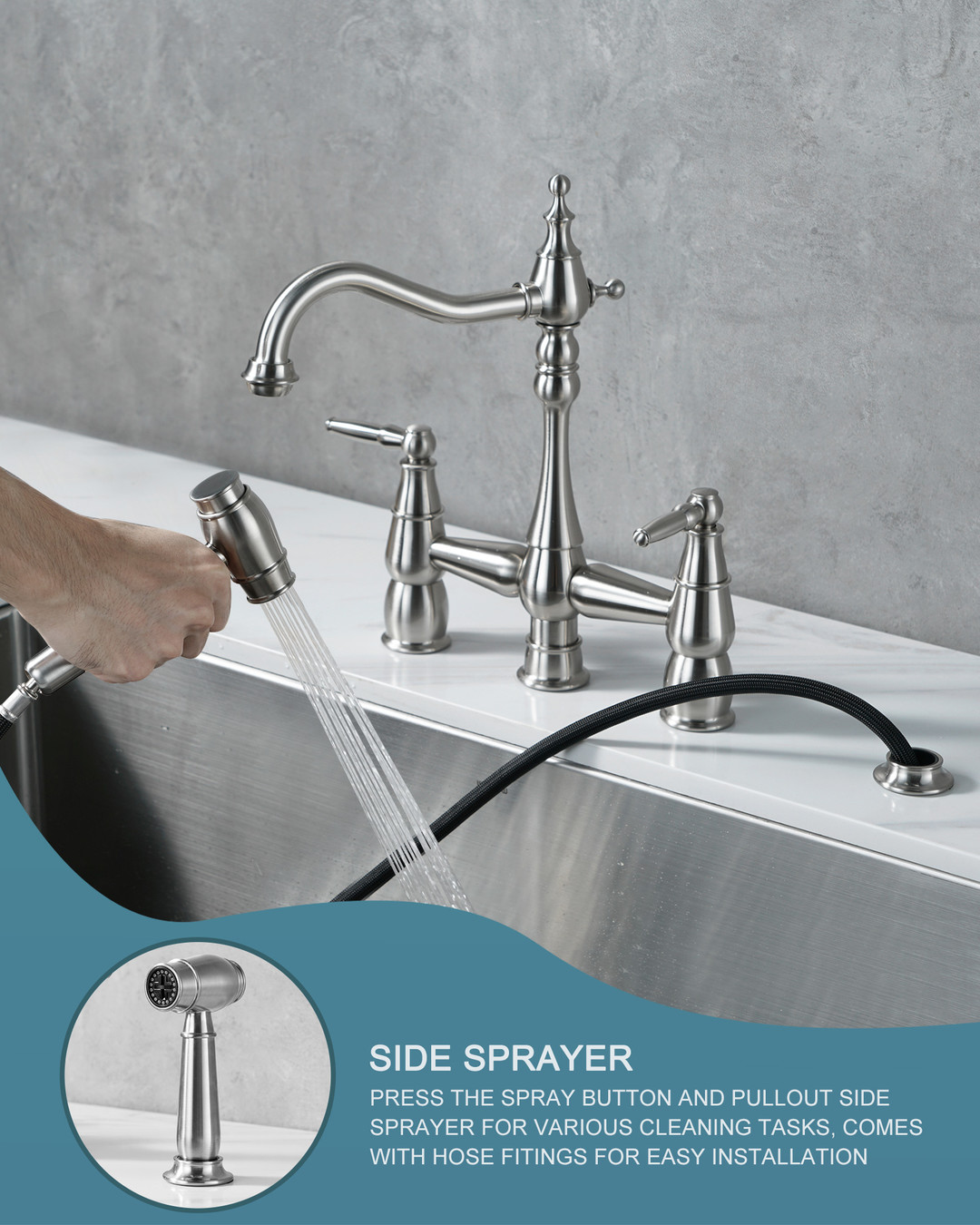 This dual-handle bridge-style vintage faucet is designed for a vintage kitchen. The 7.4 in. spout reach allows for easy rinsing, and the low-arc spout reduces splashing. The dual independent ceramic cartridges allow precise hot and cold-water control, minimizing temperature fluctuations. The 59 in. side spray hose is made of high-quality braided material to ensure leak resistance. The bridge structure paired with vintage rounded handles restores early industrial aesthetics. Connection size is 3/8 in., and it comes with a G1/2 in. adapter, compatible with modern standard plumbing. Installation time is reduced by 40% compared to traditional bridge faucets.