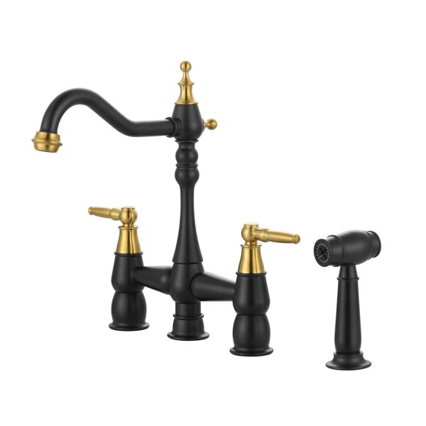 Double Handle Bridge Kitchen Faucet with Side Sprayer in Gold