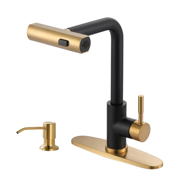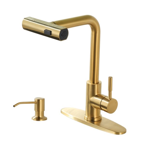 Single Handle Pull Out Sprayer Kitchen Faucet Deckplate Included with Soap Dispenser in Brushed Gold