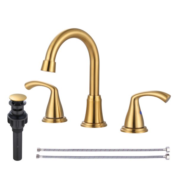 8 in. Widespread 3 Holes Double Handle Bathroom Faucet with Pop Up Drain and Supply Lines in Brushed Gold