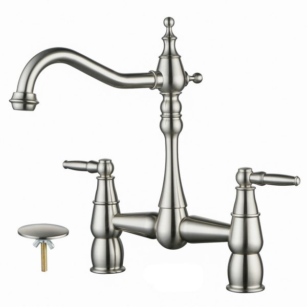 Double Handle Brass Bridge Kitchen Faucet with Side Sprayer in Brushed Nickel