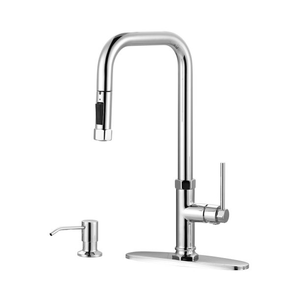 Single Handle Pull Out Sprayer Kitchen Faucet Deckplate Included with Soap Dispenser in Chrome