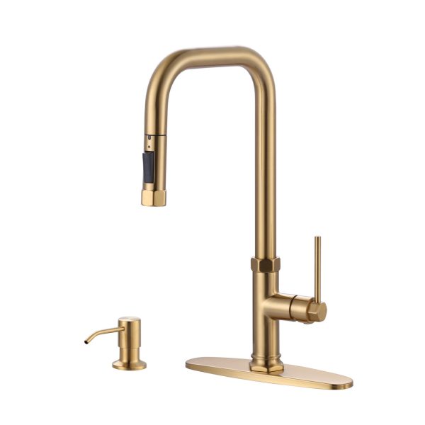 Single Handle Pull Out Sprayer Kitchen Faucet Deckplate Included with Soap Dispenser in Brushed Gold