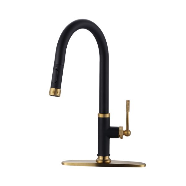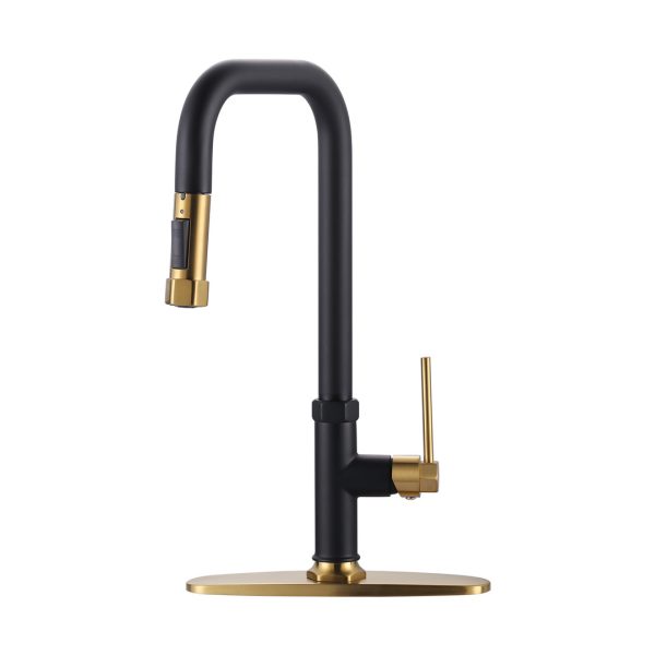 Slim Single Handle Pull Down Sprayer Kitchen Faucet with Deckplate in Gold and Black