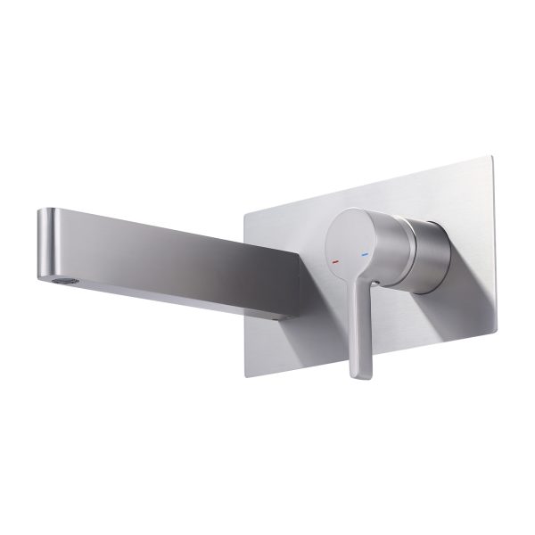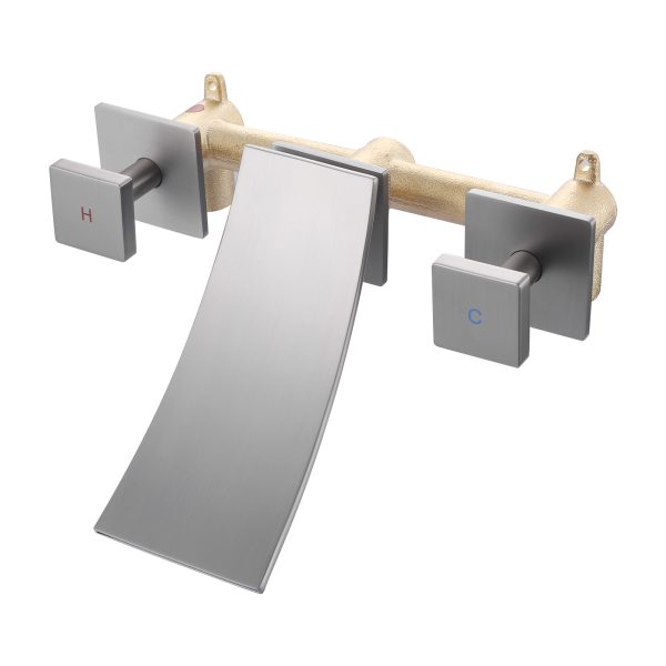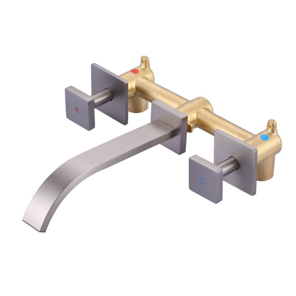 Modern Wall-Mounted Square Double-Handle Bathroom Faucet with Waterfall Spout in Brushed Nickel