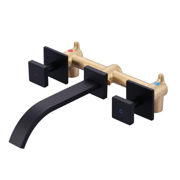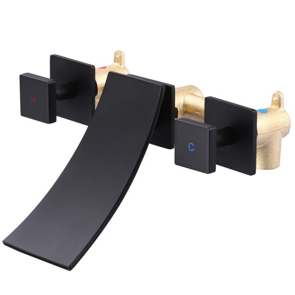 Modern Wall-Mounted Square Double-Handle Bathroom Faucet with Waterfall Spout in Matte Black