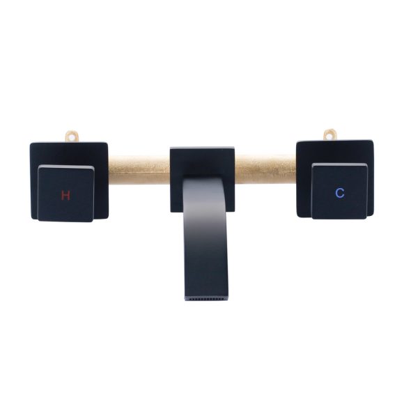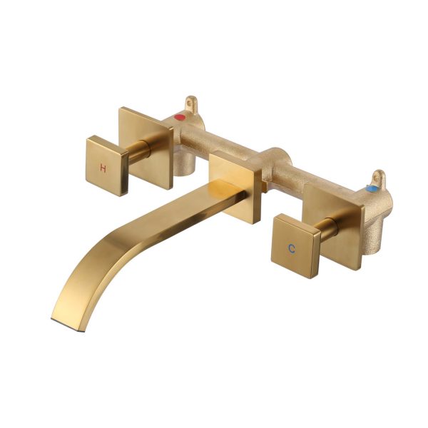 Modern Wall-Mounted Square Double-Handle Bathroom Faucet with Waterfall Spout in Brushed Gold