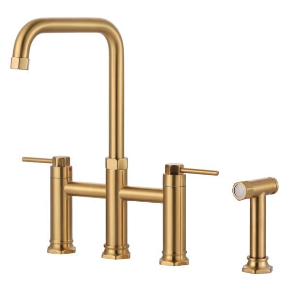 Double Handle Bridge Kitchen Faucet with Side Sprayer in Gold