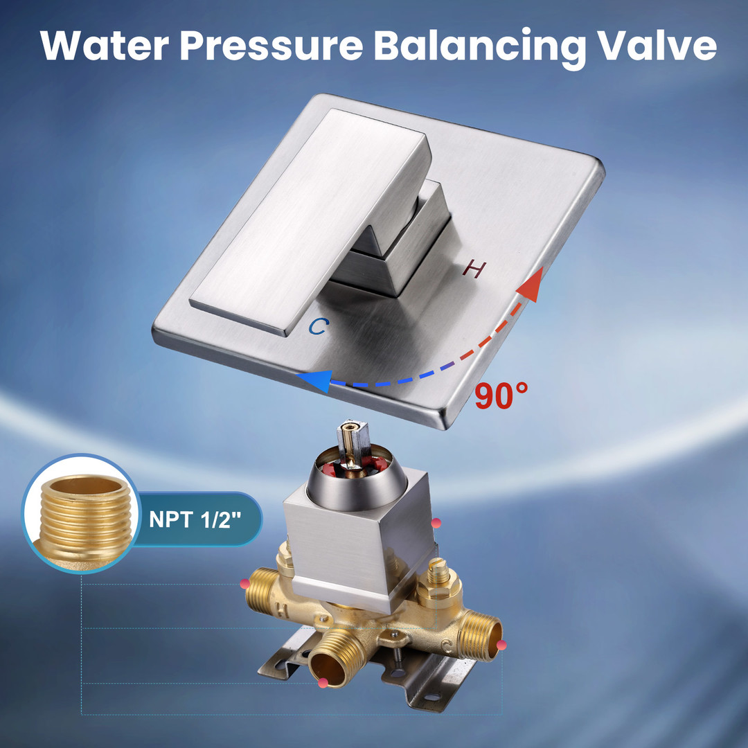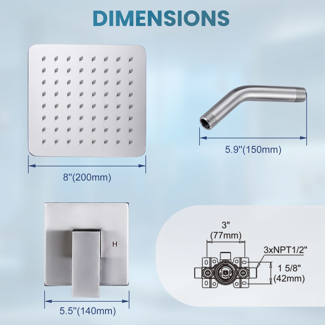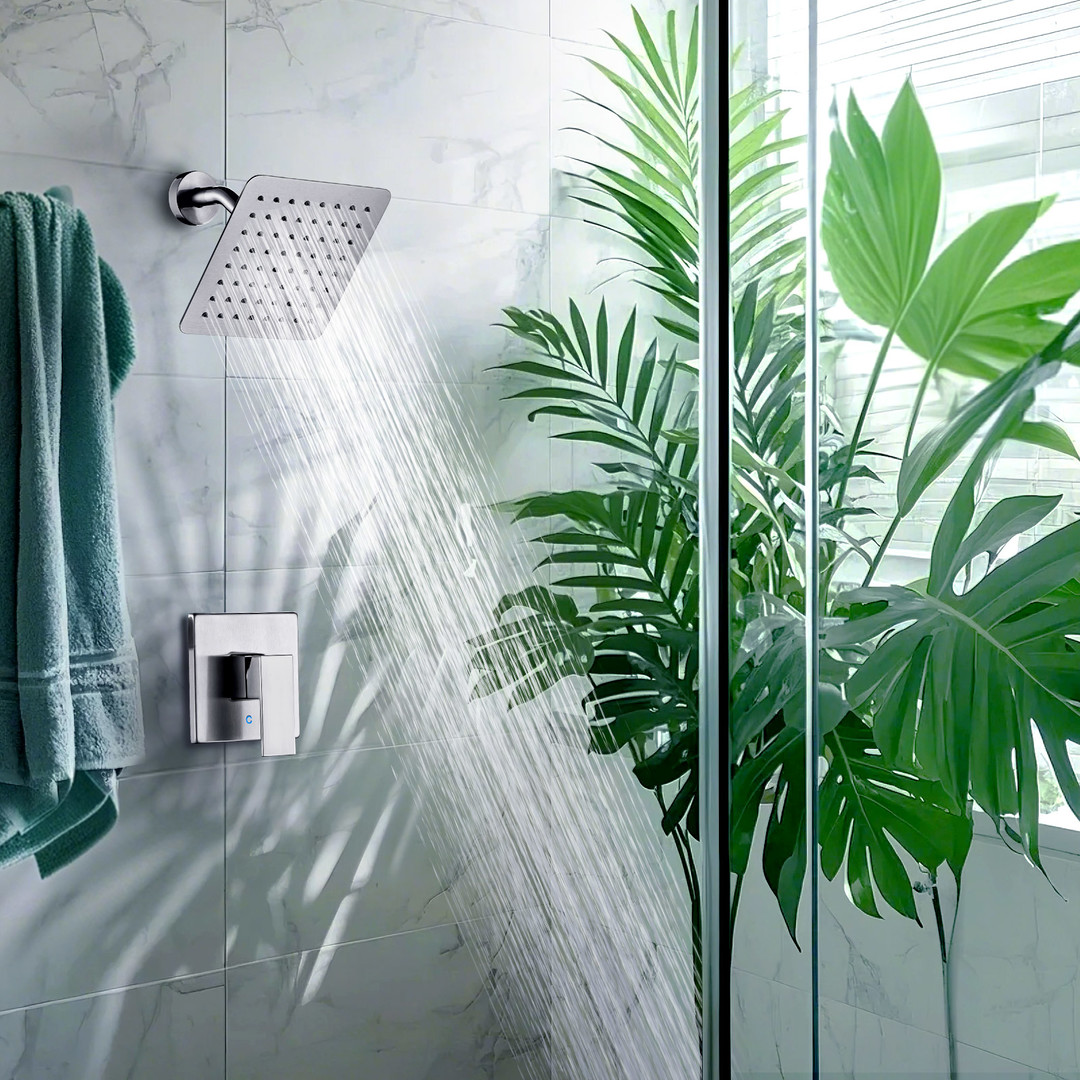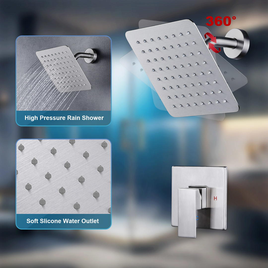 This 8 in. large square shower faucet features clean, crisp lines that perfectly complement modern decor, revitalizing your bathroom. The adjustable angle showerhead enhances your shower experience. Made from high-quality brass and stainless steel, it ensures long-term use without rust or damage. Exquisite craftsmanship guarantees lasting value, giving you peace of mind.