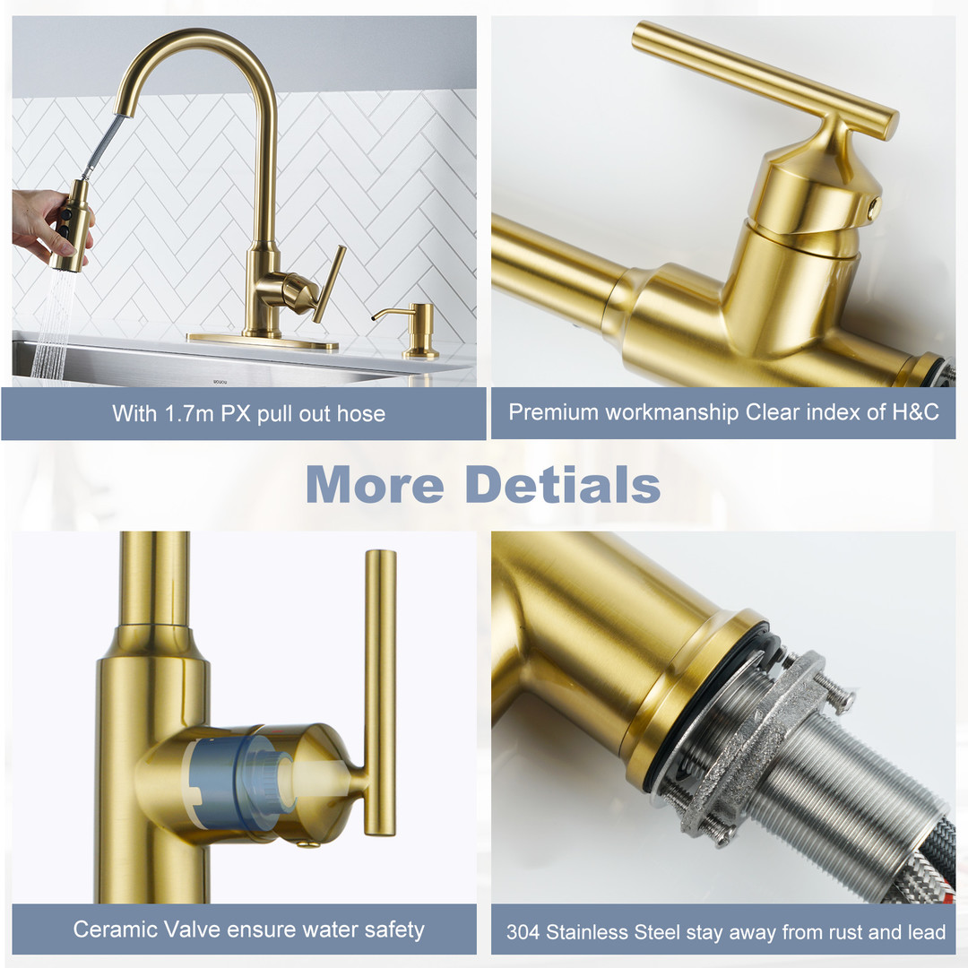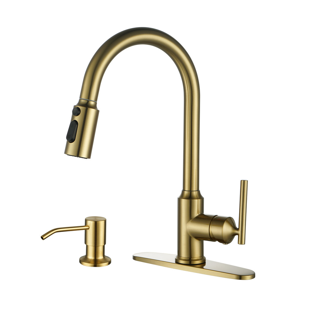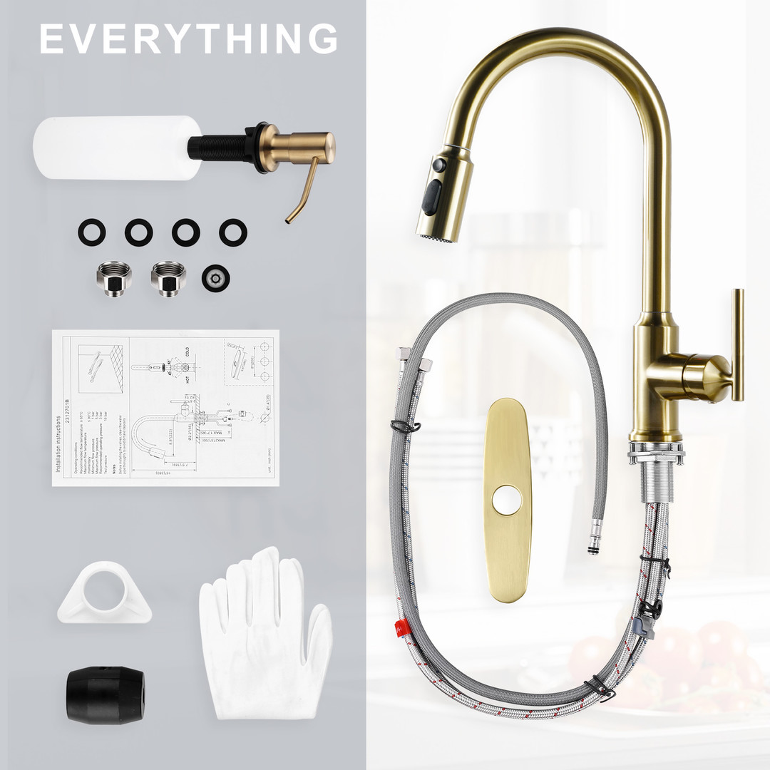 - Single-Handle Pull Down Sprayer Kitchen Faucet with Advanced Spray and Soap Dispenser in Brushed Gold