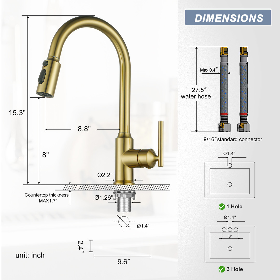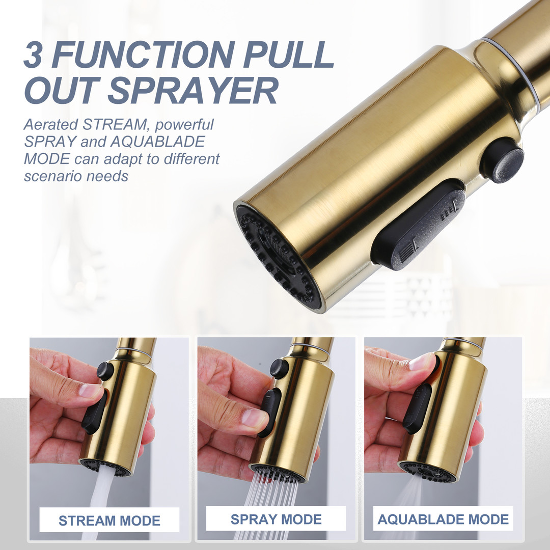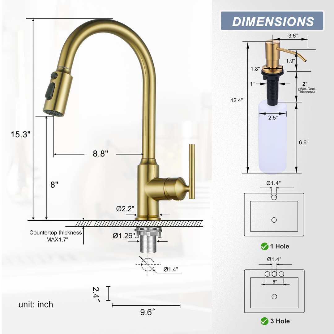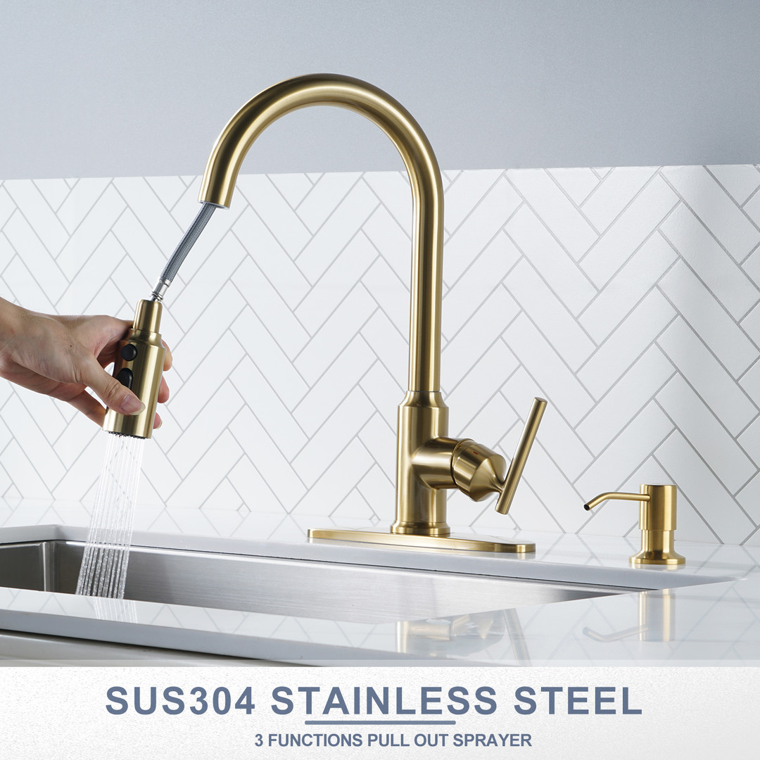 - Single-Handle Pull Down Sprayer Kitchen Faucet with Advanced Spray and Soap Dispenser in Brushed Gold