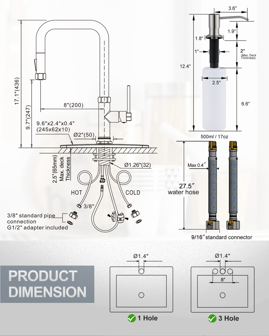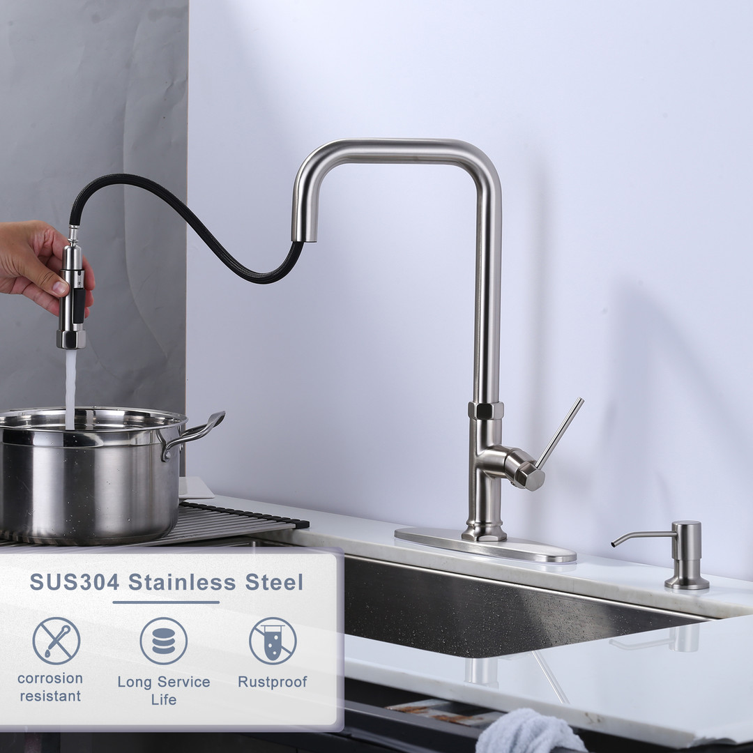 This faucet with a soap dispenser features a dual-function spray head that can rotate 360??, offering enhanced flexibility. Its stylish and minimalist design, with smooth lines, integrates seamlessly into various kitchen decors. Using gravity ball technology, the pull-down sprayer retracts effortlessly and smoothly, providing ultimate convenience.