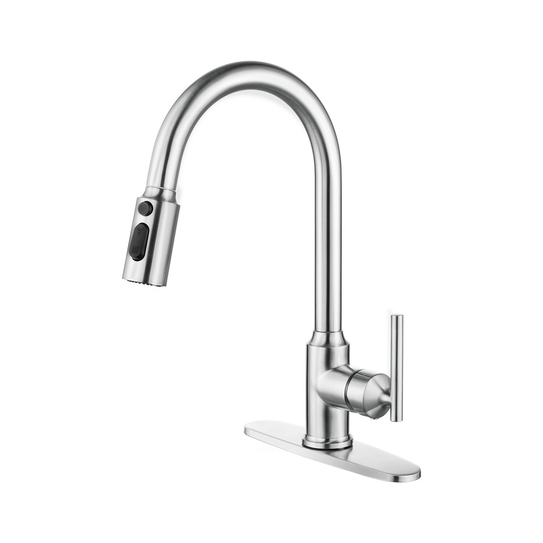 Crafted from premium stainless steel, this kitchen faucet delivers durability and modern style for everyday use. The high-arc spout provides generous clearance for filling pots and rinsing dishes, while its 5.9-inch reach ensures full basin coverage without overspray. A single lever handle offers smooth, precise control of water temperature and flow, making daily tasks effortless. Built to resist rust and corrosion, the faucet maintains a clean look even with frequent use. Designed for easy installation, the set includes braided supply lines and mounting hardware-providing a complete solution for upgrading your kitchen with reliable performance and sleek design.