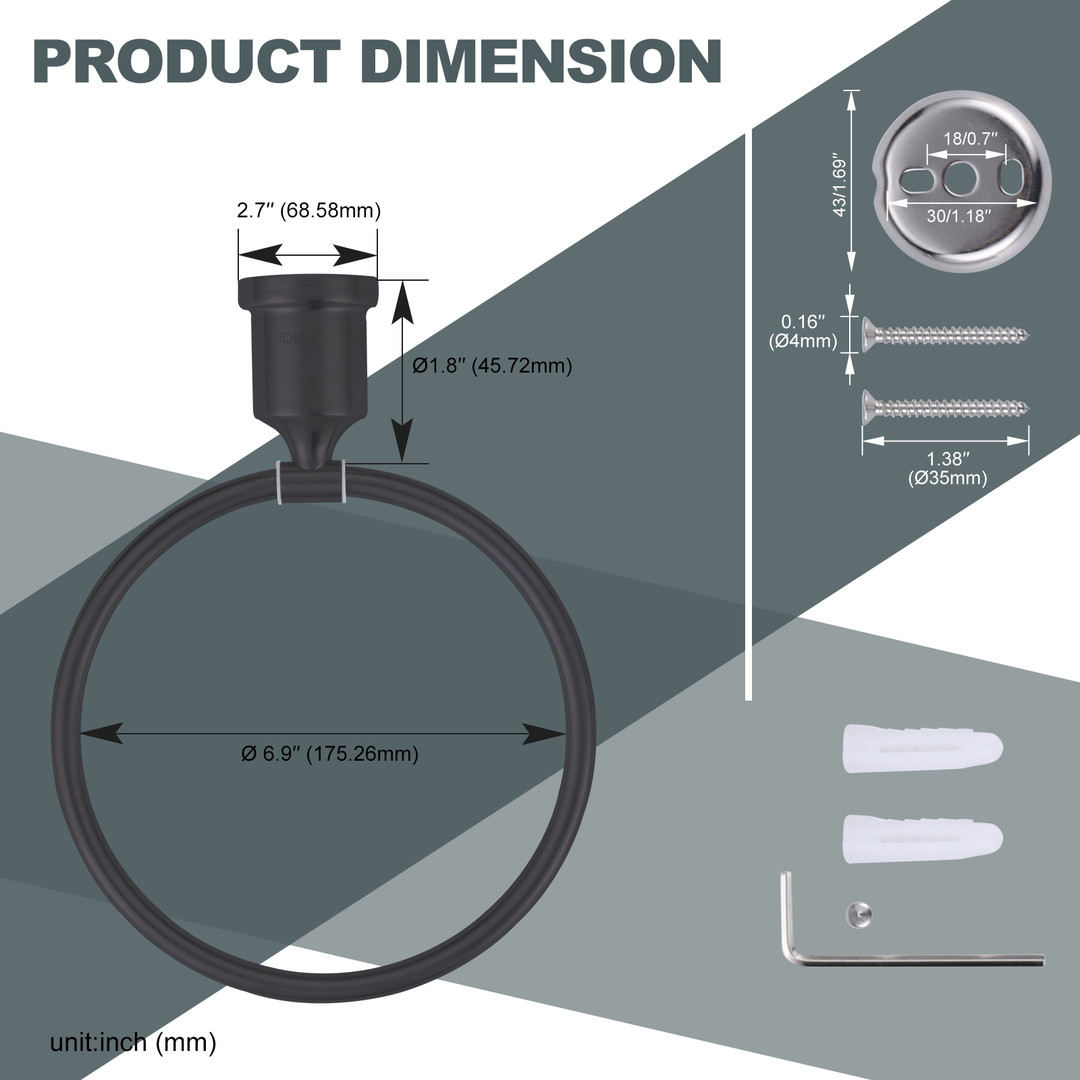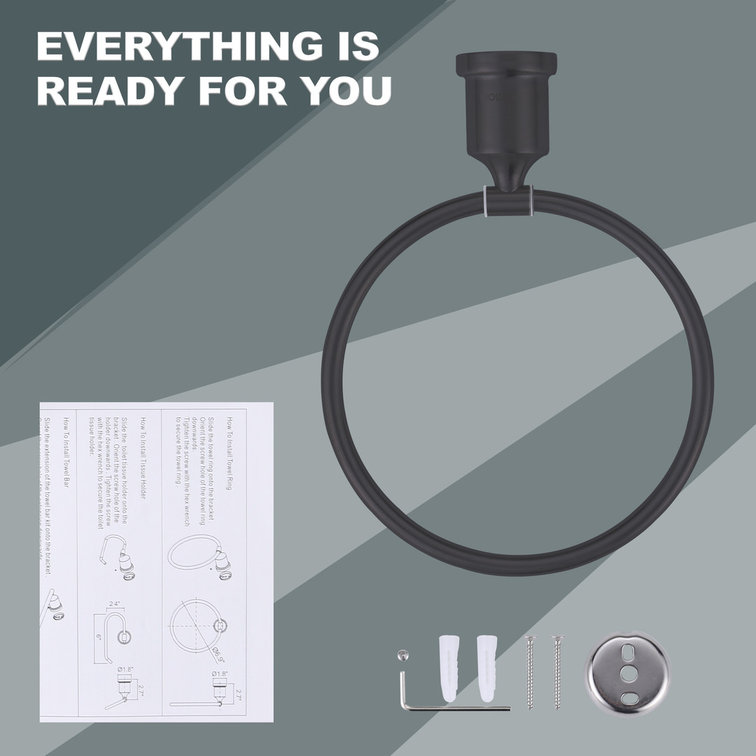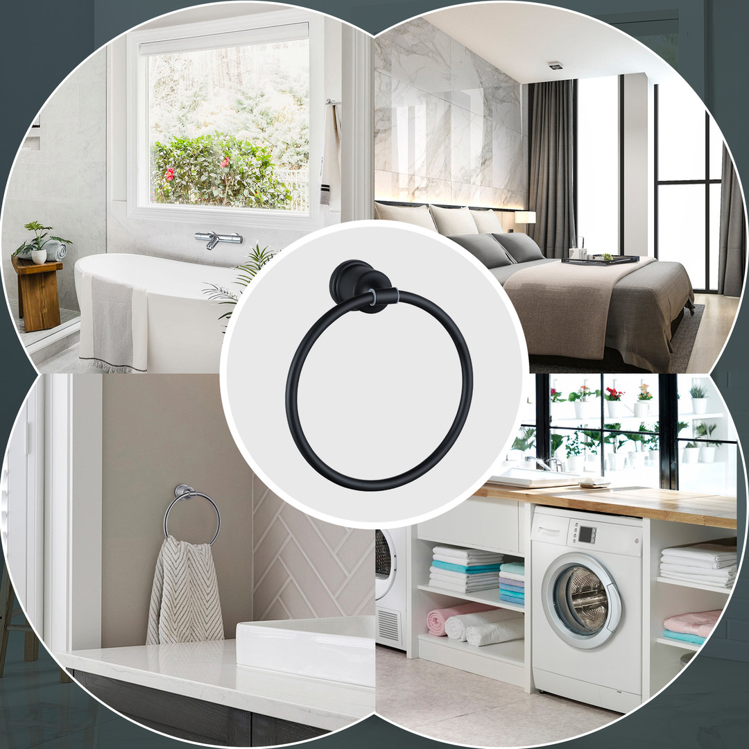Elevate your bathroom interior with this wall-mounted towel ring. A matte black finish creates a smooth style. To make installation convenient, it includes mounting hardware. It features a 180-degree rotating towel ring that can stay any angle and a rubber washer that can mute in swinging. For durability, it offers a strong load-bearing capacity and waterproof, rust-resistant 304 stainless steel construction.